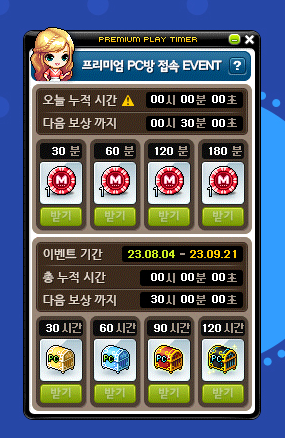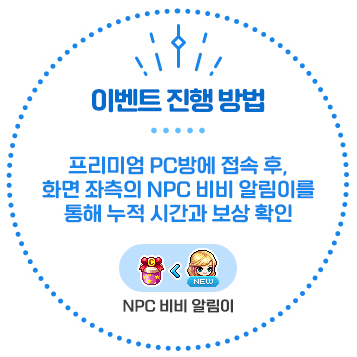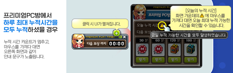[메이플스토리] PC방 이벤트 메이플스토리 프리미엄PC방 원격피시방 지피방 120시간 일일 접속 마일리지 보상