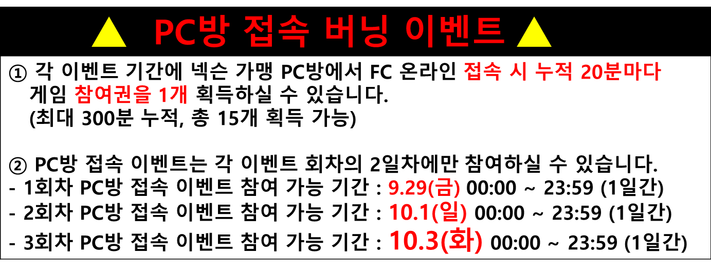 FC 온라인 에프씨온라인 피파온라인4 버닝 PC방혜택 이벤트 접속보상 원격피시방 지피방 집피방 수수료할인 쿠폰