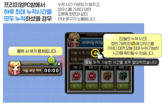 일일 누적 접속시간 보상은 프리미엄 PC방에서만 받을수 있습니다.