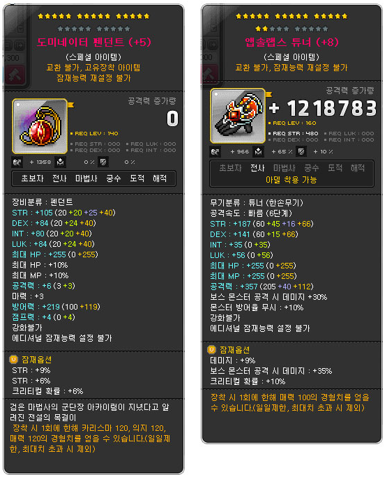 메이플스토리 도미네이터 펜던트(+5), 앱솔랩스 튜너 (+8)
