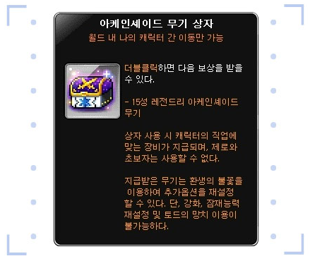 사용시 캐릭터 직업에 맞는 15성 레전드리 아케인셰이드 무기 1종을 선택하여 획득할 수 있습니다.