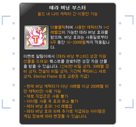 테라 버닝 부스터는 10~199레벨 사이의 캐릭터에게 사용할 수 있으며, 사용시 6주간 테라 버닝 효과가 적용됩니다.