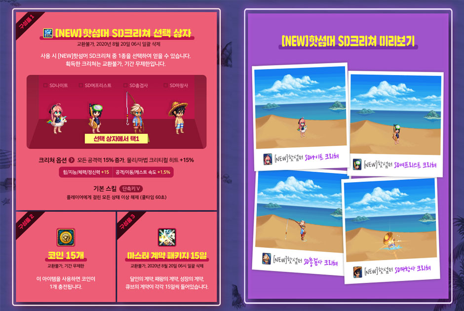 코인 15개, 마스터계약 패키지 15일, 핫섬머 SD크리쳐 선택상자