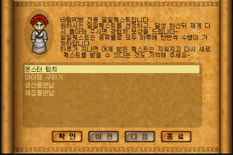 - 몬스터 퇴치, 아이템 구하기, 생산품 반납, 채집물 반납 등을 완료하면